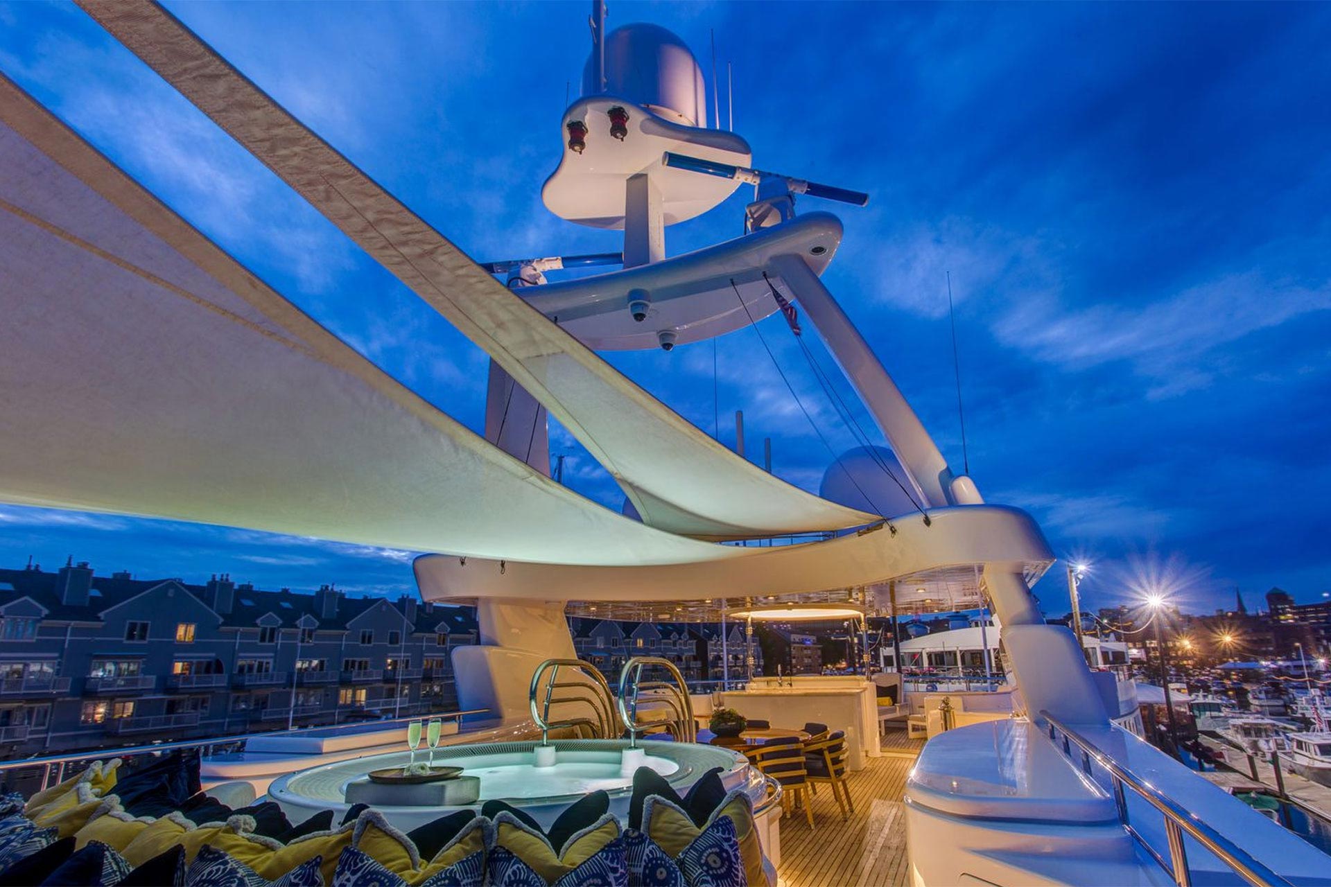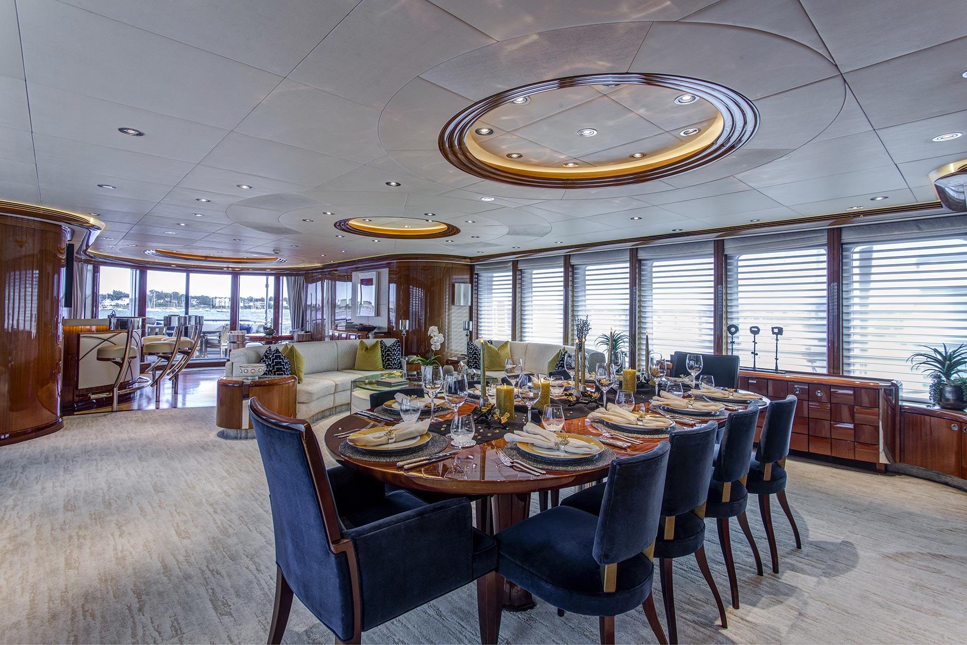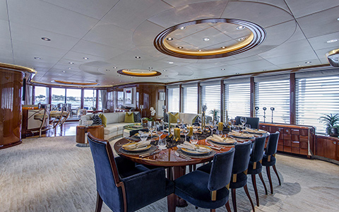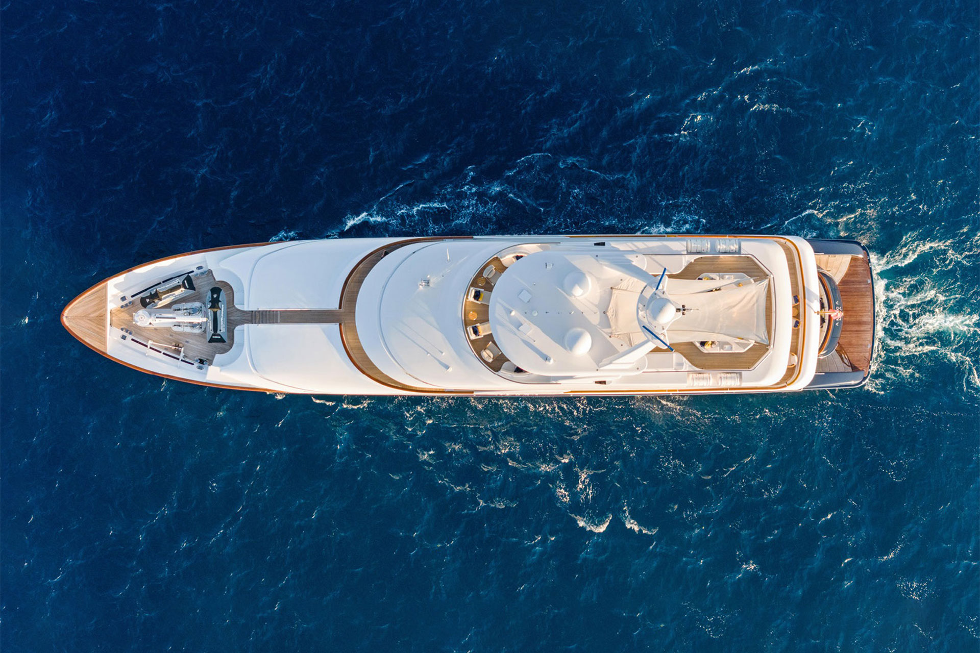 Outdoors, AMICA MEA’s expansive sundeck features a Jacuzzi surrounded by sunpads, perfect for soaking up rays. The shaded dining area and forward bar with built-in seating offer endless leisure options. All water toys, including a towed tender, are tucked away in the garage and bow, keeping the decks open and guest-focused. Her zero-speed stabilizers provide smooth cruising, whether at sea or anchored in a tranquil bay.