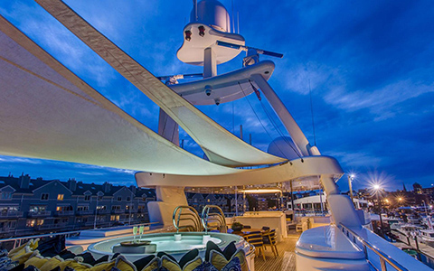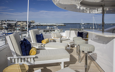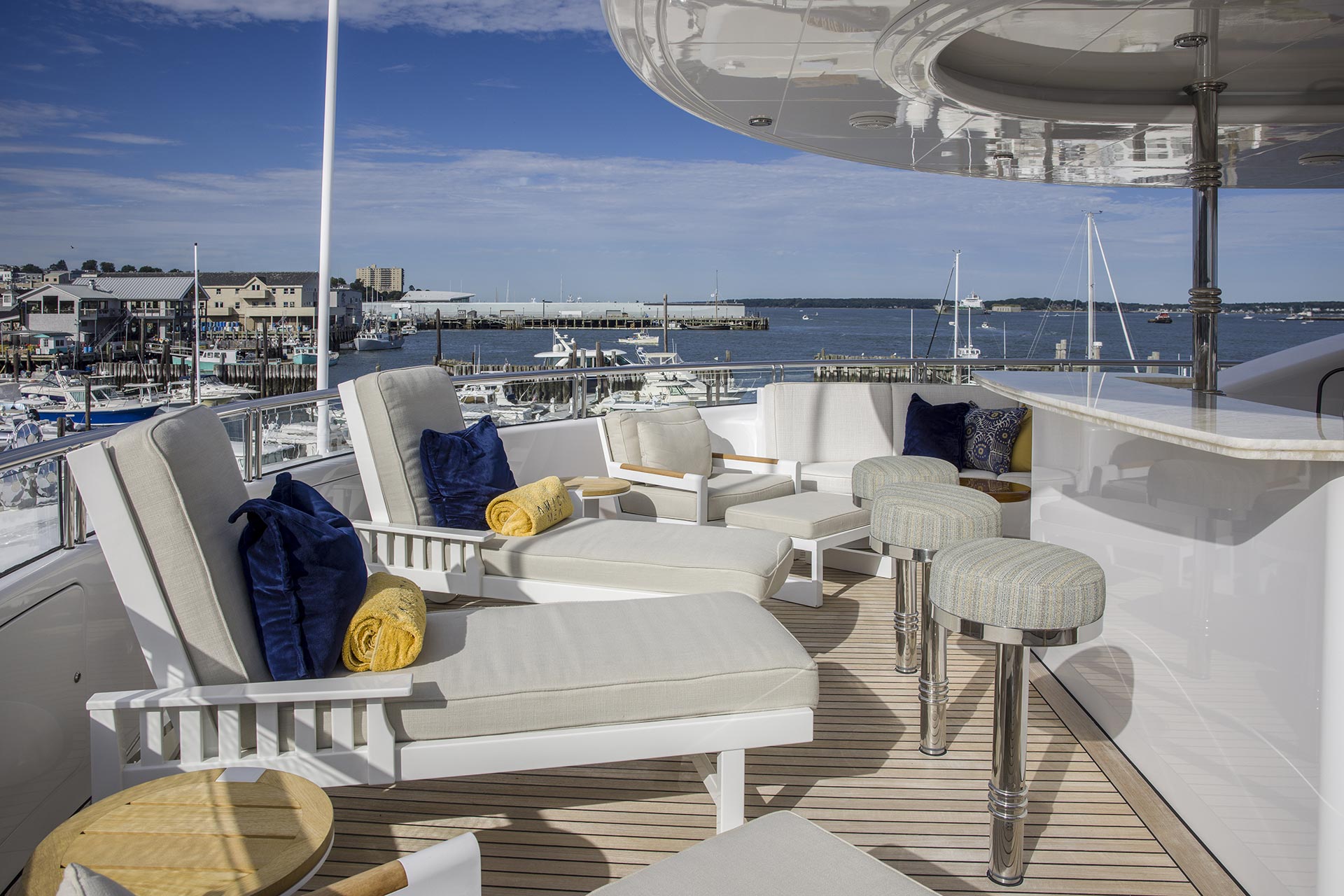 The skylounge is another social hub. A large bar with a woven cherry wood backdrop spans the forward section of the space, while two custom sofas and a projector screen create a lounge that easily transforms into a cozy theater for movie nights. The aft skylounge deck is the perfect spot for alfresco dining, with a spacious table and comfortable seating for all guests, complete with retractable awnings for shade.