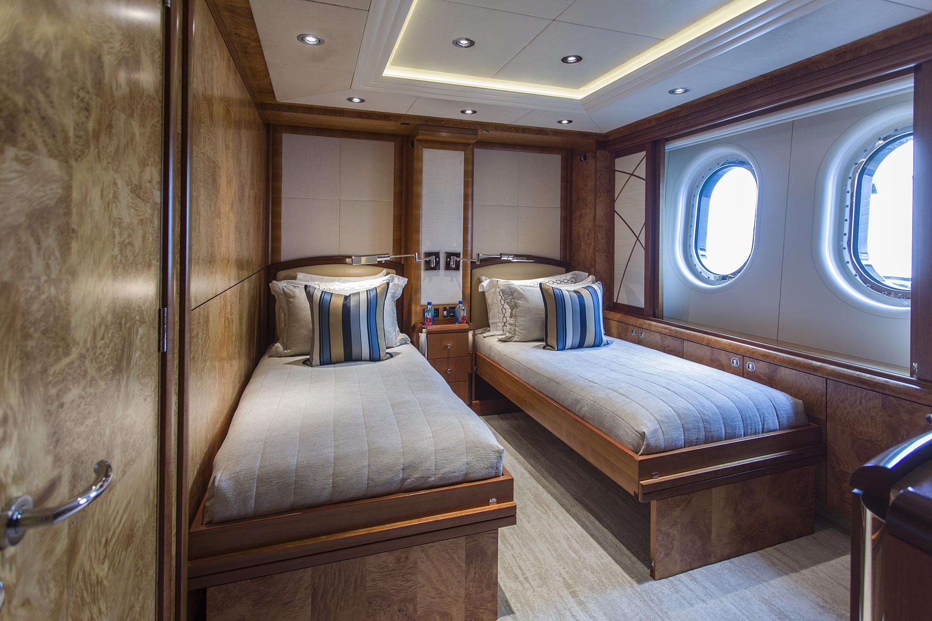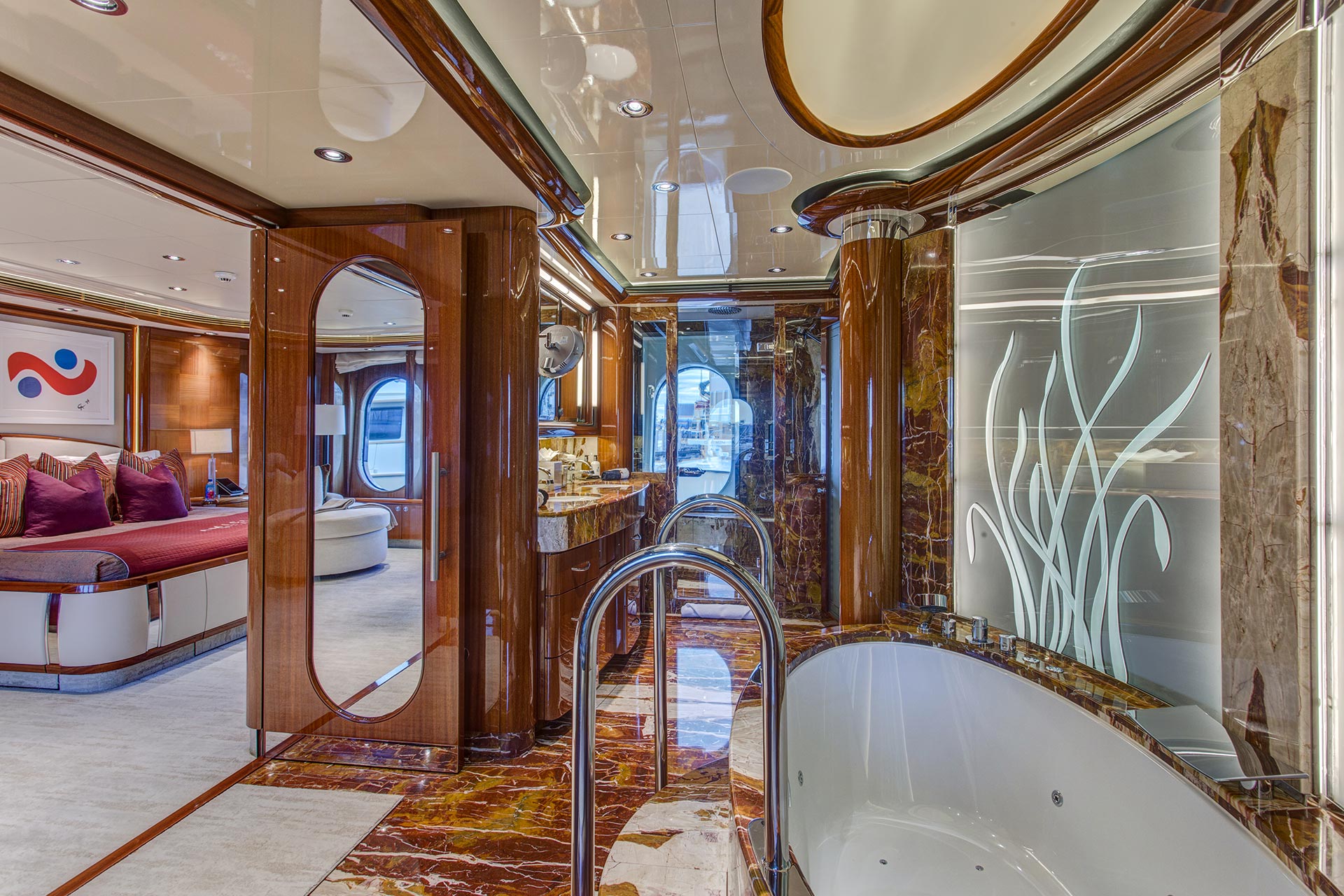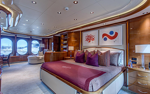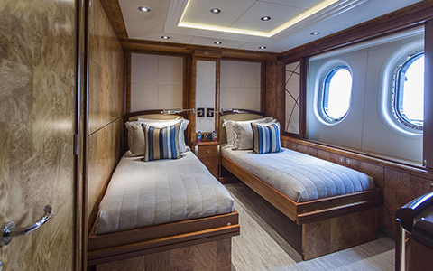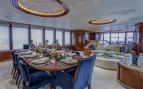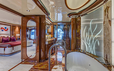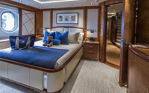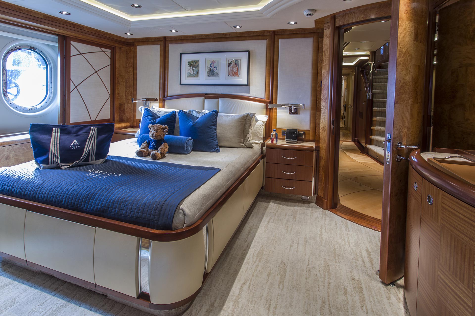 AMICA MEA comfortably accommodates up to 11 guests across five cabins. The master suite on the main deck is a sanctuary, complete with a lounge area, study desk and double doors that open to an ensuite bath with a grand marble Jacuzzi tub and etched glass accents. Three queen guest cabins on the lower deck offer privacy and comfort, each featuring ensuite baths with marble showers and double vanities. A twin cabin with a Pullman provides flexible sleeping arrangements, making this layout ideal for families or groups of friends.