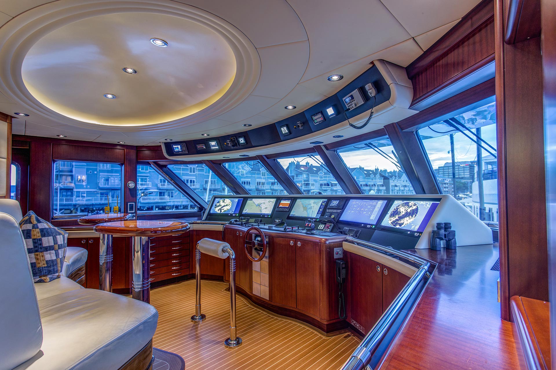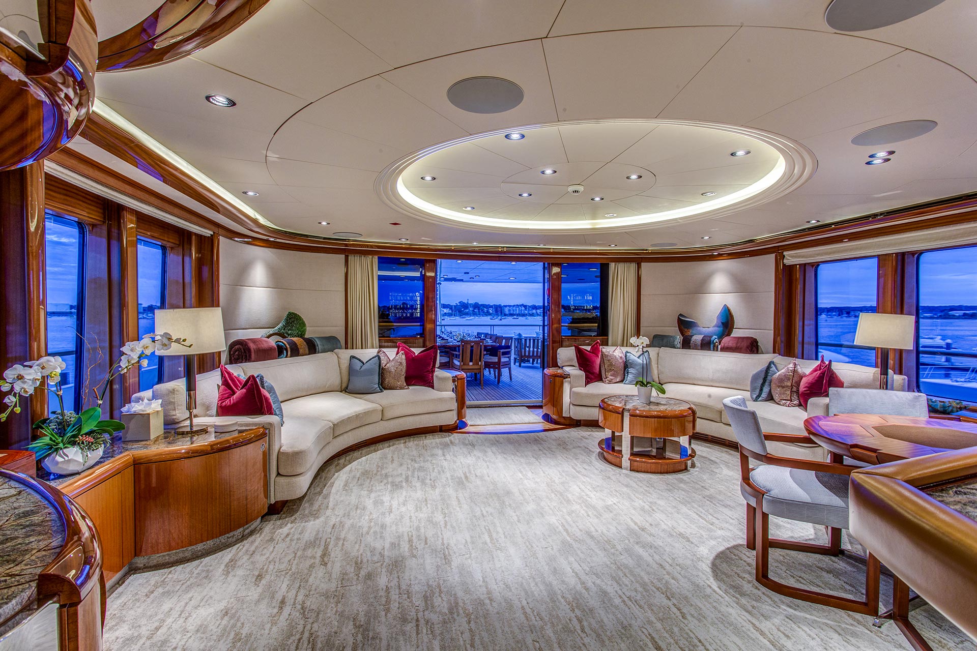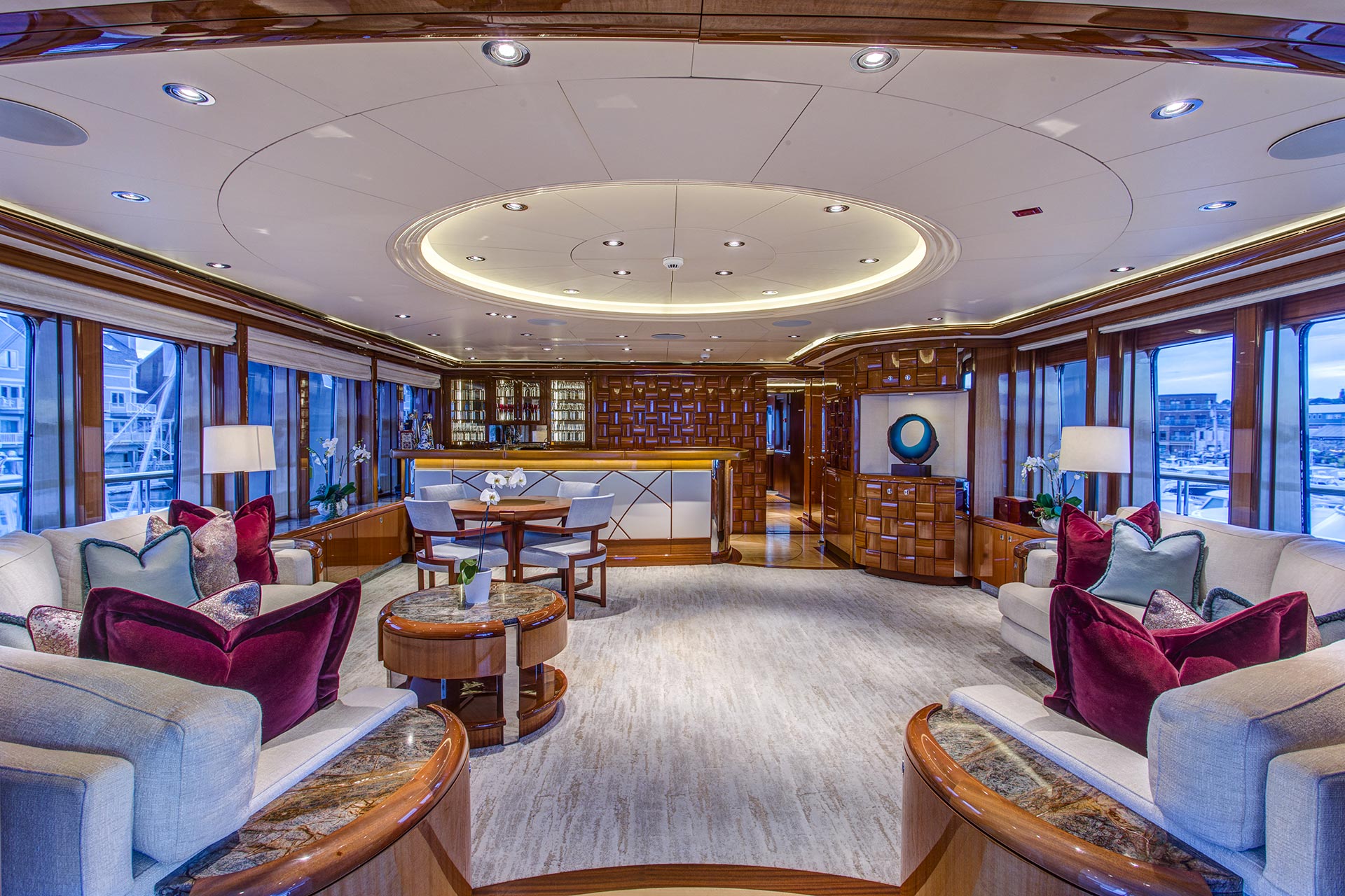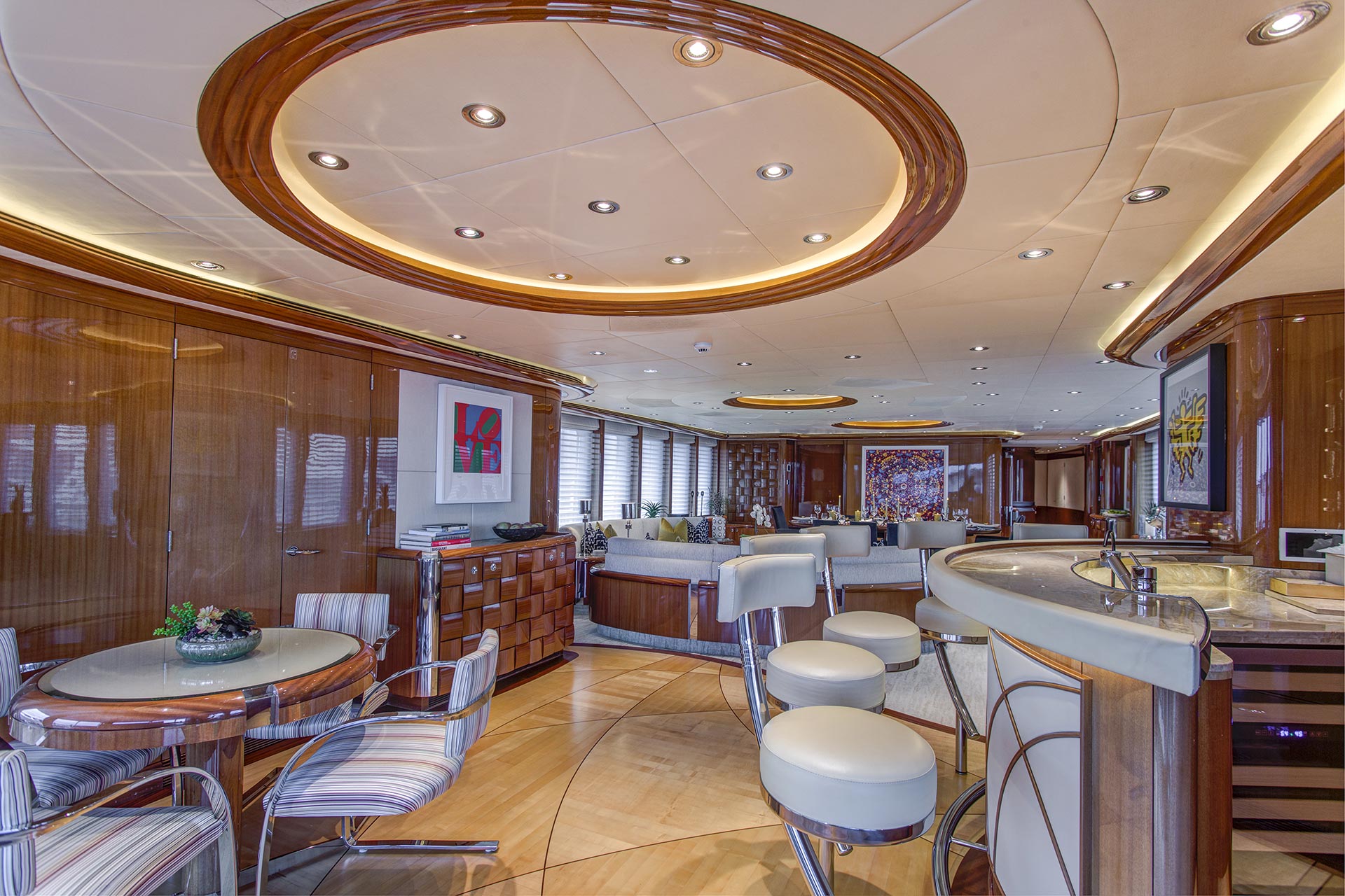 Step aboard through sliding doors to the main salon, where a chic half-moon bar with a backlit glass cabinet sets the stage for entertainment. Just a few steps away, a cozy round table with four chairs invites you to enjoy a cocktail or a quiet game, while two plush sofas provide ample seating around a coffee table with pull-out ottomans for additional comfort. Moving forward, the formal dining area, separated from the salon yet bathed in light, comfortably seats 10 around a stunning cherry wood table. The cherry and burl wood décor throughout the salon is warm and inviting.